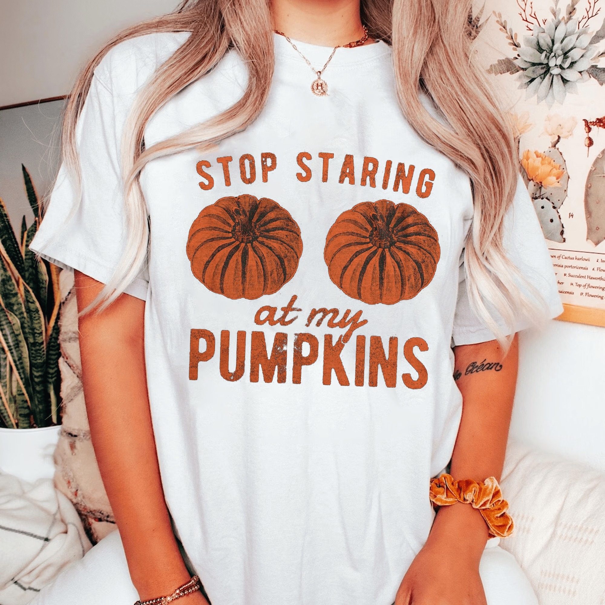 Stop Staring At My Pumpkins T-Shirt Black Funny Halloween Shirts For Women Gifts For Girlfriend
